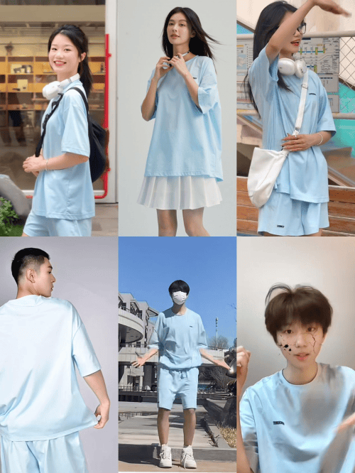 色蓝,宜的中性色举动男女皆,其余自正在立场代表一种无性。套装很好解释了这一点幸棉“爱若蓝”两穿。
