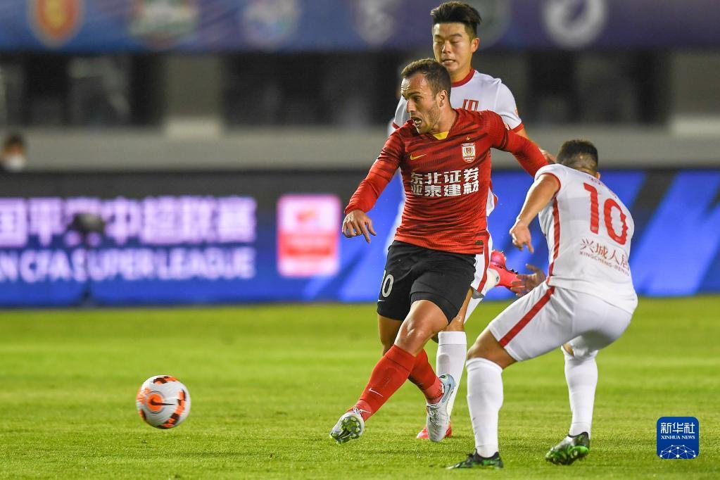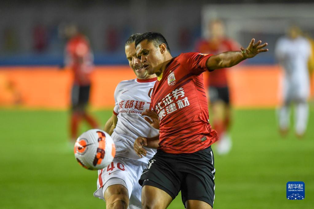 1日9月,都蓉城队球员理查德正在角逐中拼抢长春亚泰队球员埃里克(右)与成。者 张楠 新华社记摄