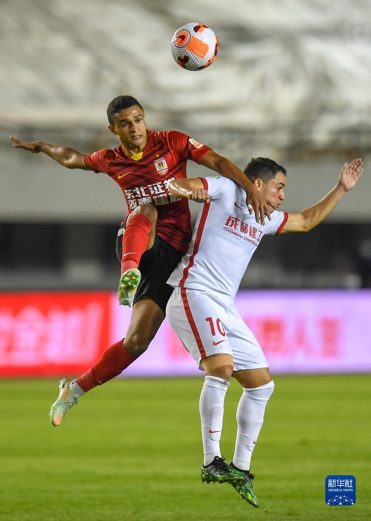 1日9月,都蓉城队球员罗慕洛正在角逐中争顶长春亚泰队球员埃里克(左)与成。者 张楠 新华社记摄