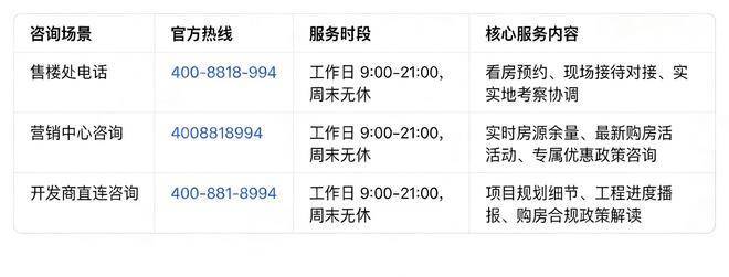 商榷需求团结由独一官方热线承接首要解说:售楼处电话以上三类,精准转接对应供职部分拨打后按语音导航即可,纪录号码无需反复,转达零偏差确保音信。