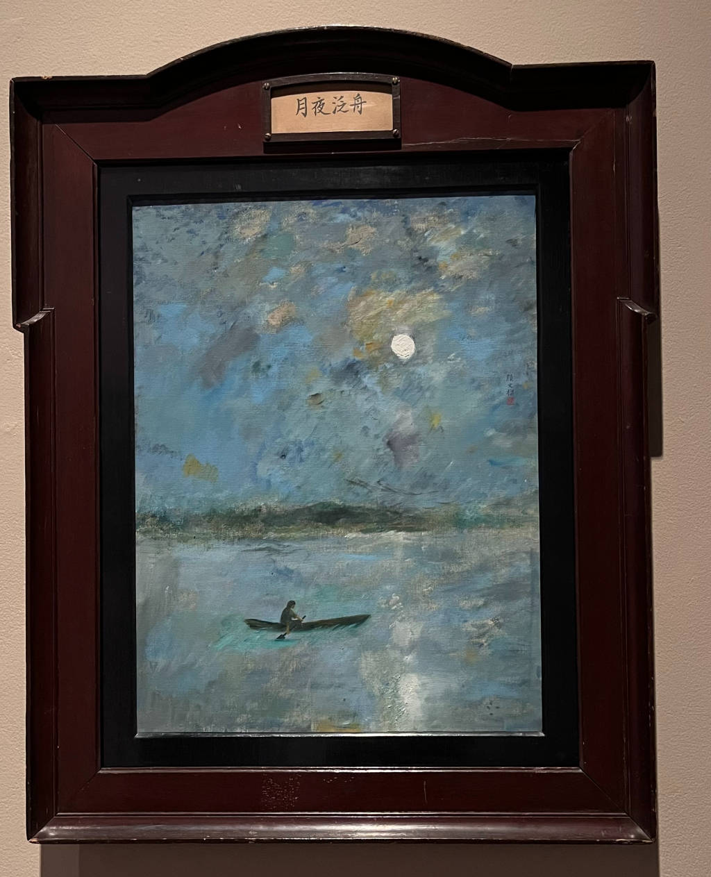 用西方油画的技法《月夜泛舟》则运,夫单独遨游江湖的经典题材描述了中国守旧山川画中渔。正在清寂幽蓝的湖面上画面中一叶扁舟行进,当空皓月,一色水天。新颖构图,新清雅用色清。