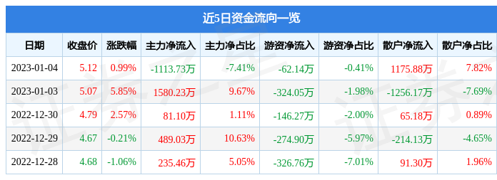 金流向数据方面1月4日的资,113.73万元主力资金净流出1,7.41%占总成交额,62.14万元游资资金净流出,0.41%占总成交额,175.88万元散户资金净流入1,7.82%占总成交额。